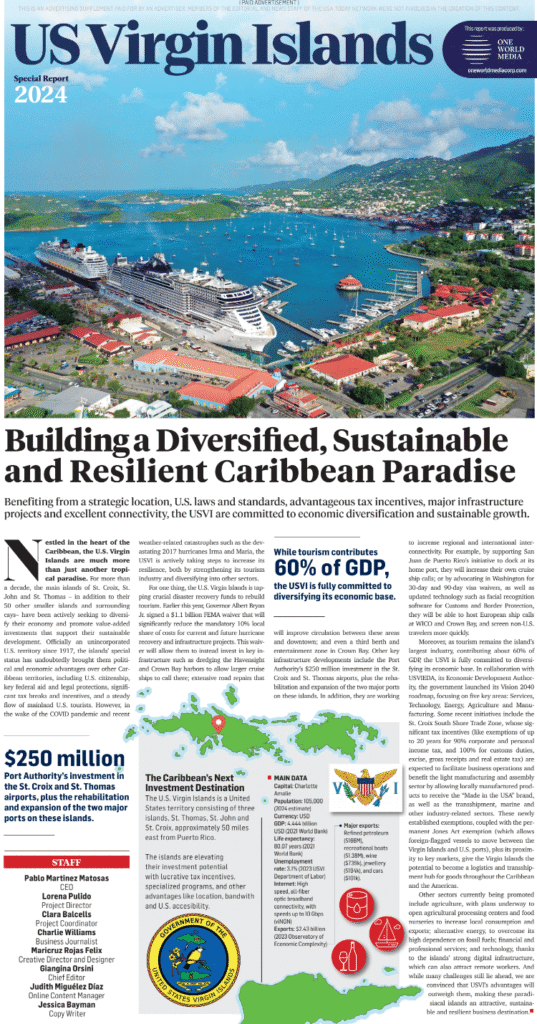 Other sectors currently being promoted include agriculture, with plans underway to open agricultural processing centers and food nurseries to increase local consumption and exports; alternative energy, to overcome its high dependence on fossil fuels; financial and professional services; and technology, thanks to the islands’ strong digital infrastructure, which can also attract remote workers. And while many challenges still lie ahead, we are convinced that USVI’s advantages will outweigh them, making these paradisiacal islands an attractive, sustainable and resilient business destination.